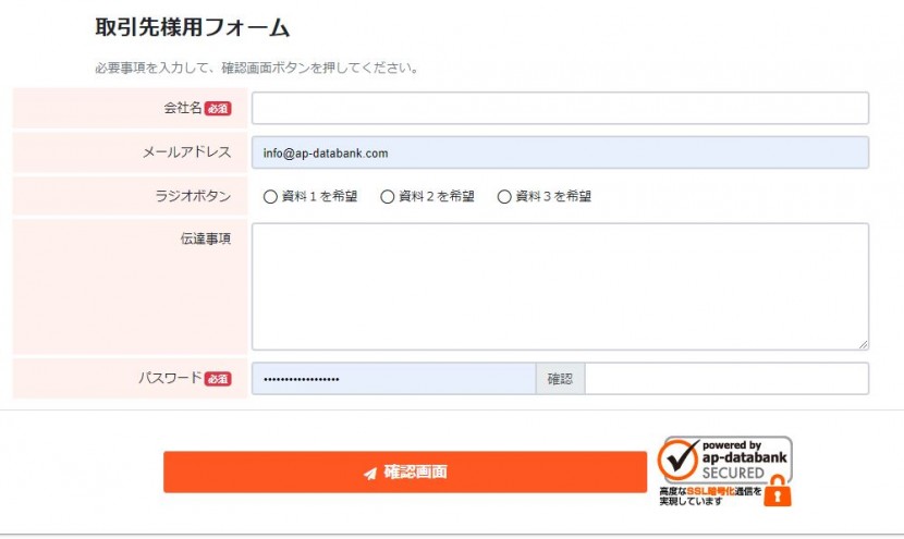 パスワード機能を設定することで特定の取引先・業者専用のフォームとなります。このフォームの自動返信に資料などを添付することが可能な為、取引先から注文書がほしい、発注書がほしいなどのメール問合せを自動的に解決します。